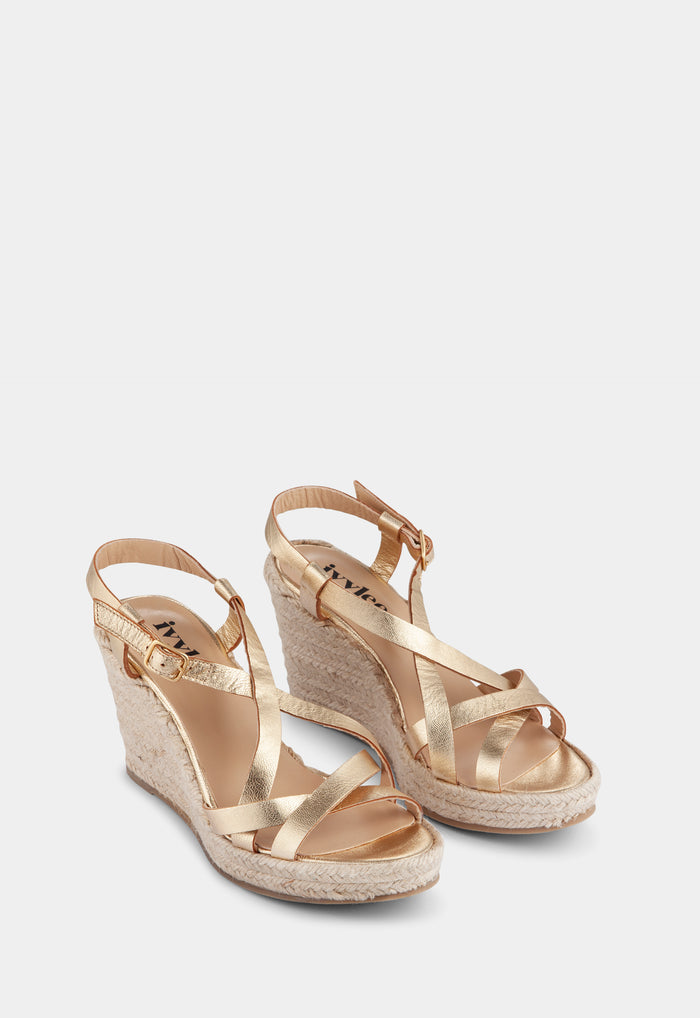 The Maya Sandal is a modern take on classic espadrilles. Handmade in Portugal from metallic leather using traditional techniques, it rests on comfortable jute wedge soles, while the crossover straps frame a fresh pedicure.